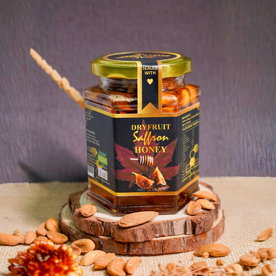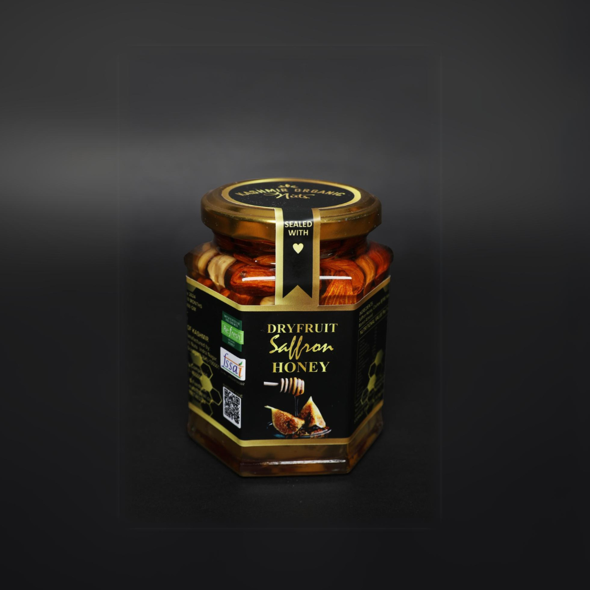 Kashmir Organic Dry Fruit Saffron Honey is a luxurious blend of pure, golden honey infused with the rich flavors of premium dry fruits and the exotic aroma of saffron. Sourced from the pristine valleys of Kashmir, this honey offers a unique taste experience, combining the natural sweetness of honey with the nutty crunch of almonds, walnuts, and cashews, all delicately enhanced by the distinctive essence of saffron. Perfect for adding a gourmet touch to your tea, desserts, or breakfast, this honey is a wholesome treat packed with nutrients and antioxidants.