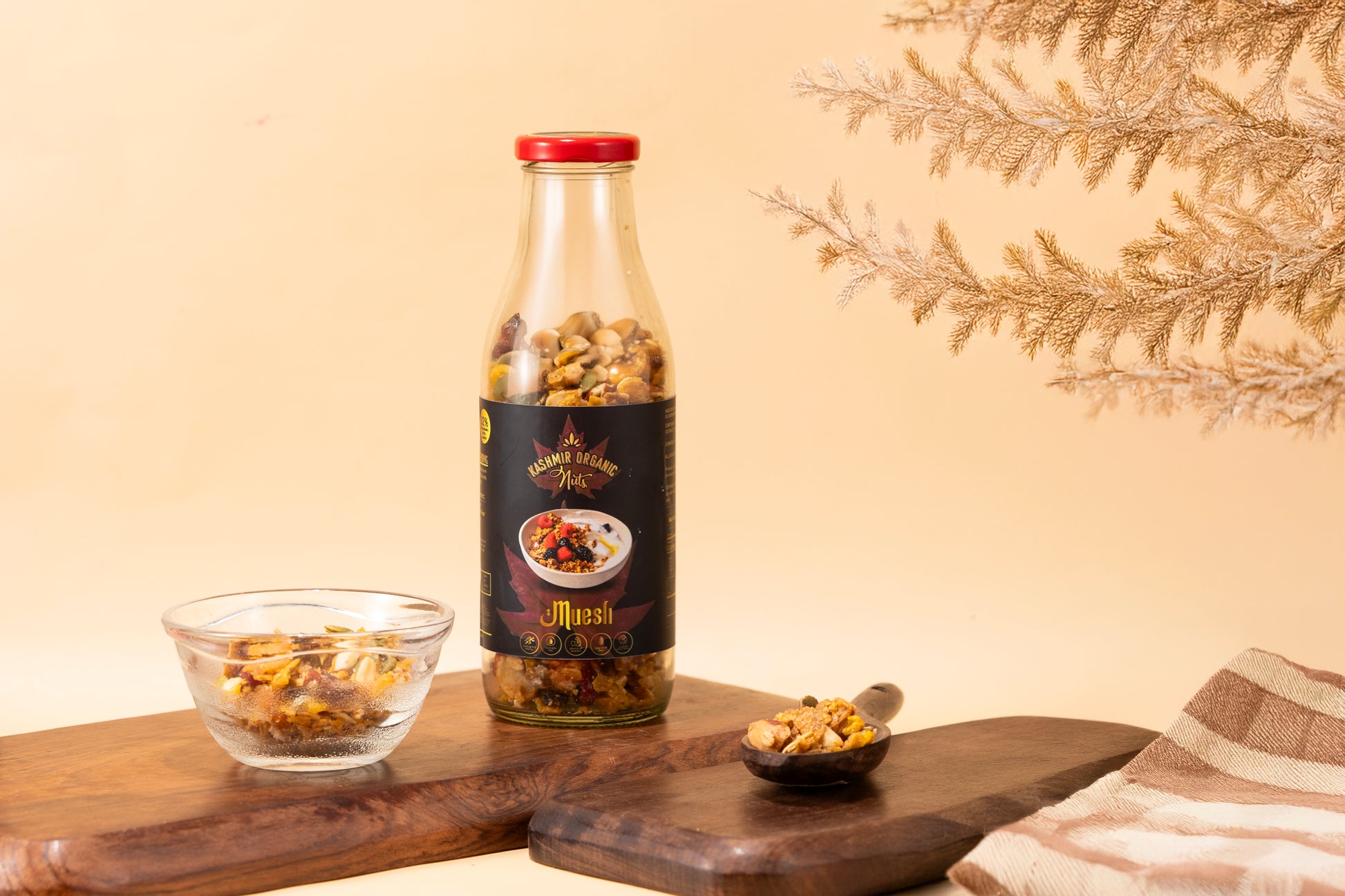 Kashmir organic muesli made from a mix of rolled oats, cereal cranberry blueberry nuts, seeds, and dried fruits) or organic muesli